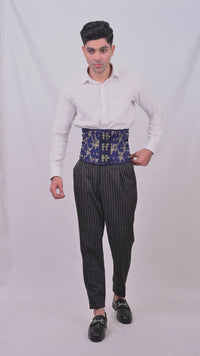 Introducing our Navy Blue Satin Men Waist Cincher – a luxurious piece designed to shape and tone your waist while delivering a sophisticated and confident look. Crafted with rich navy blue brocade fabric, enhanced with elegant gold detailing on a blue background, this corset combines traditional style with modern luxury. Featuring a triple-layer construction for ultimate strength and durability, it's the perfect blend of fashion and functionality.