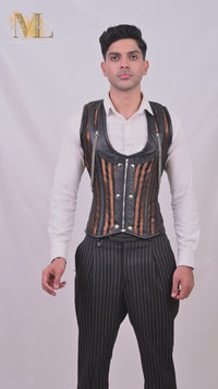 Golden Line Brocade Corset Vest with Black Leather & Chains - Front Zip Closure